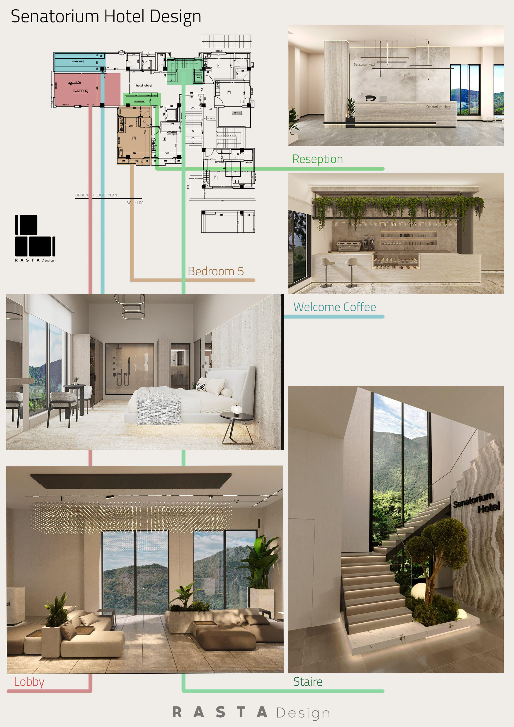 طراحی هتل سناتوریوم به درخواست شرکت هتل دار و به مدیریت آقای دکتر حسینی تبار به منظور آسایش کاربران که برای فراق خاطر از شلوغی ابر شهرها ودور شدن از آشفتگی وسختی مشاغل خود به دل طبیعت به گروه معماری رستادیزاین برای طراحی واگزار شد.